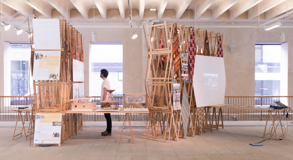 El montaje de la exposición ha sido diseñado por el arquitecto y Alumni del CEU Guillermo Sánchez Sotés, con una propuesta de muy bajo coste que reutiliza borriquetas existentes y telas africanas creando “muros” expositivos.